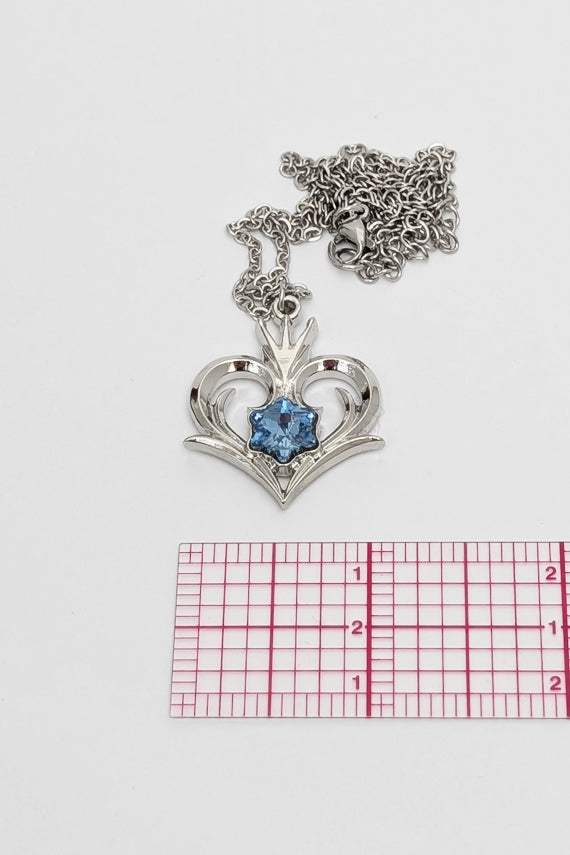 Need a huge boost in Strength and Magic? This pendant was inspired by the Crystal Regalia accessory in Kingdom Hearts 3. It's made from metal and features the signature heart shape, swirl patterns, and a crown on top. A blue snowflake shaped gem sits in the center. This stunning piece will aid with style and battlegates for Keyblade wielders.