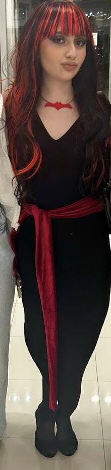 Add Thorn's necklace and gloves! Complete your Hex Girls ensemble with Thorn's red bat necklace and black fingerless opera gloves.